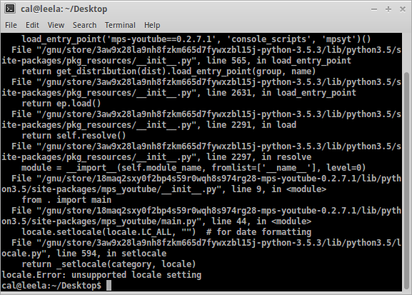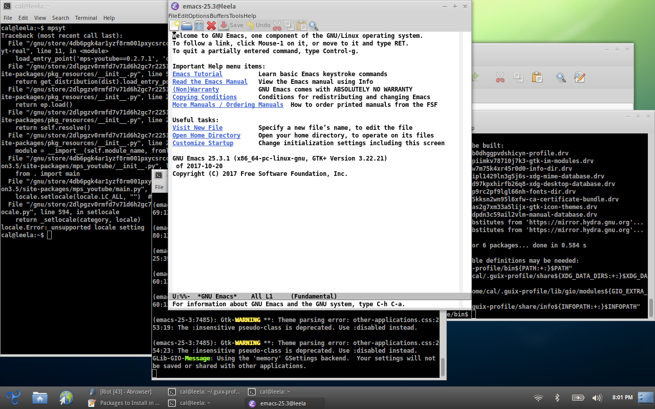 <CharlieBrown>killing process 3262guix package: error: build failed: some substitutes for the outputs of derivation `/gnu/store/x9bi3ap4nrll69qzcqflm94v56d0fb3l-nss-certs-3.33.drv' failed (usually happens due to networking issues); try `--fallback' to build derivation from source <CharlieBrown>`youtube-dl`gives a bunch of Python errors and complaints about locale. <lfam>CharlieBrown: Usually there will be some other useful information printed when substitution fails like that. Can you put it on a paste site? <CharlieBrown>This happened while I was trying to `guix pull` and `guix package -u`. <lfam>CharlieBrown: I was talking about the NSS issue <lfam>youtube-dl is working for me, so I'm not sure what's up there <CharlieBrown>All environment variables were lost, because I did `export FOO=bar` in the terminal like everything else, because I followed the installation guide very literally. <CharlieBrown>Oh, I forgot! I just installed `ncsd` and need to check it out. I hadn't configured that yet, because I wasn't sure if I should install it with APT or Guix. <CharlieBrown>I still don't know where to set yenvvironmyenvariablyenv Triyenv <CharlieBrown>Sorry. My keyboard was acting up. When Gedit or Firefox are running slow, some keys on my keyboard print random letters when I'm trying to type. Even Backspace and Enter. <CharlieBrown>`guix package -u` still gives a substitution error for `nss-certs` and says `killing process 3581`. <lfam>CharlieBrown: That's weird, I'm not sure what happened. I would re-run the command with --fallback <lfam>I was able to download that substitute <CharlieBrown>lfam: `--fallback` seemed to work, but I still get errors about locale &c. <CharlieBrown>I put `source $HOME/.guix-profile/etc/profile` in `~/.bashrc` so I can run Emacs from the terminal, although I still can't do it from GNOME, and the GTK widgets look broken. <CharlieBrown>The other Python apps, like `youtube-dl`, do run, though. <lfam>By the way, I recommend exporting these things from ~/.bash_profile or ~/.profile, but not ~/.bashrc. The former is used when you log in, but the latter is used every time you open a new Bash shell, which is usually undesirable <CharlieBrown>lfam: I thought sourcing `$HOME/.guix-profile/etc/profile` would set all the env. vars, because Guix put them all there. <CharlieBrown>export GUIX_LOCPATH=$HOME/.guix-profile/lib/locale` to .profile. <xelxebar>Testing out IRC client. Would someone mind mentioning me? <buenouanq>CharlieBrown: you say `buen' twice while doing a somersault ***drp_ is now known as drp