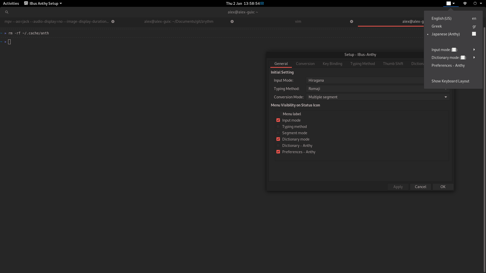 <pkill9>i think it's a little misleading to say multiple versions of things can be installed with guix, because in practise it's not possible out-of-the-box due to file name conflicts <pkill9>you can install them to separate profiles and call them manually, but it's not quite the same as `guix install ...` <raghav-gururajan>pkill9 I think different versions produce output with different hashes, thus producing unique directories inside the store. <pkill9>raghav-gururajan: yea they do, but just because it's in the store doesn't mean it's installed <pkill9>e.g. running `guix install` puts it into your profile, which is integrated into the system through environment variables like PATH and XDG_DATA_dirs *raghav-gururajan --> afk <alextee[m]>i broke something again, gnome's ctrl+shift+alt+R doesn't work :/ <alextee[m]>you'll see a red circle on the top right of the screen, next to the language s elector <hexagonal-sun>A quick question if that's okay - whenver I install a package to my user's profile, I end up building profile.drv at the end which seems to take a good few minutes. <hexagonal-sun>Is that expected? That doesn't seem to happen on another machine that's running guix <hexagonal-sun>(I only have a minimal number of packages in my profile, around 30) <bavier>hexagonal-sun: expected. the creation might just be happening much more quickly on your other machine <wdkrnls>is it necessary to run guix pull to update a custom channel? <wdkrnls>My guess is that it is necessary; but I'm hoping maybe their is a faster way to do testing. <wdkrnls>I think the license is called expat. <yrk>Gooberpatrol66: "expat" perhaps? <alextee[m]>leoprikler: screen recording, it doesn't work anymore <leoprikler>Commit: 7922b6f795eb575084546ec9bfb9d40508a9378e <ngz>That Rust packaging is puzzling. Some of the packages use "#:skip-build? #t", others don't. Some of the package use rust-...-X.Y naming scheme, while others only use rust-...-X. I saw the discussion on the ML, but is there a reference somewhere? <hexagonal-sun>'sudo -e guix system reconfigure /etc/config.scm' <reboot> then 'guix package -u'? <leoprikler>you can guix package -u before rebooting and you don't necessarily have to reboot after reconfigure <NieDzejkob>and the flag only matters if you use GUIX_PACKAGE_PATH <hexagonal-sun>Hmm, I don't have GUIX_PACKAGE_PATH defined but if I do a system reconfigure without the -E guix complains and says I should run guix pull before hand <NieDzejkob>you'd realize pretty quickly considering that -e opens your editor :D <pkill9>yay gnome clocks, now my laptop has a timer <leoprikler>hexagonal-sun: it uses your normal guix but assumes it's root's <hexagonal-sun>right, but I want it to use my profile, I only need root as it's modifying system stuff <leoprikler>that's why people use -E or pull as root once and ignore it <leoprikler>raghav-gururajan: I think gdk-pixbuf is the only non-native input in libmediaart <leoprikler>gettext-minimal is for generating gettext stuff during build